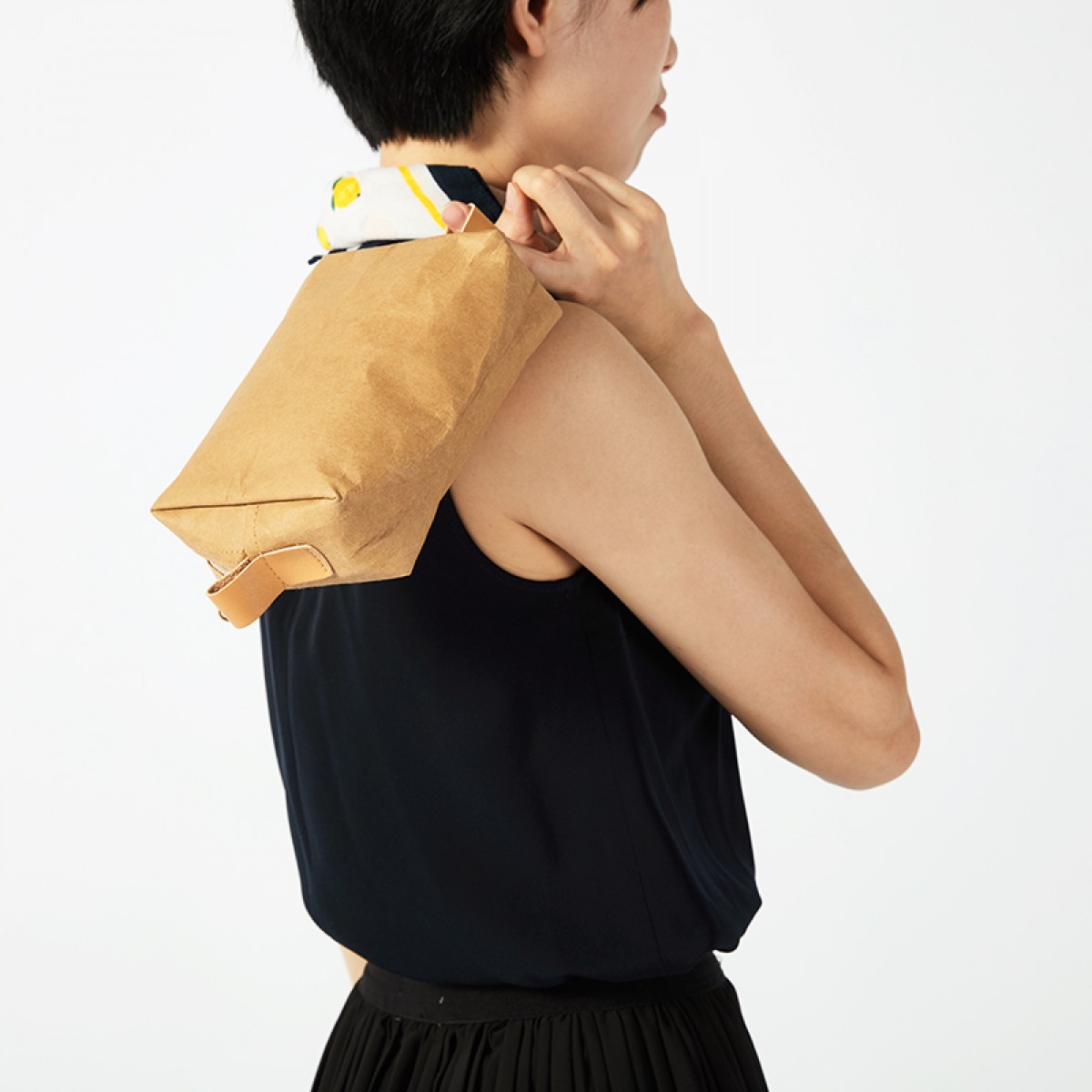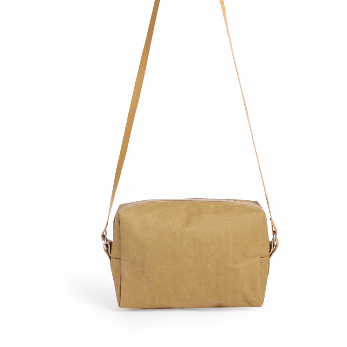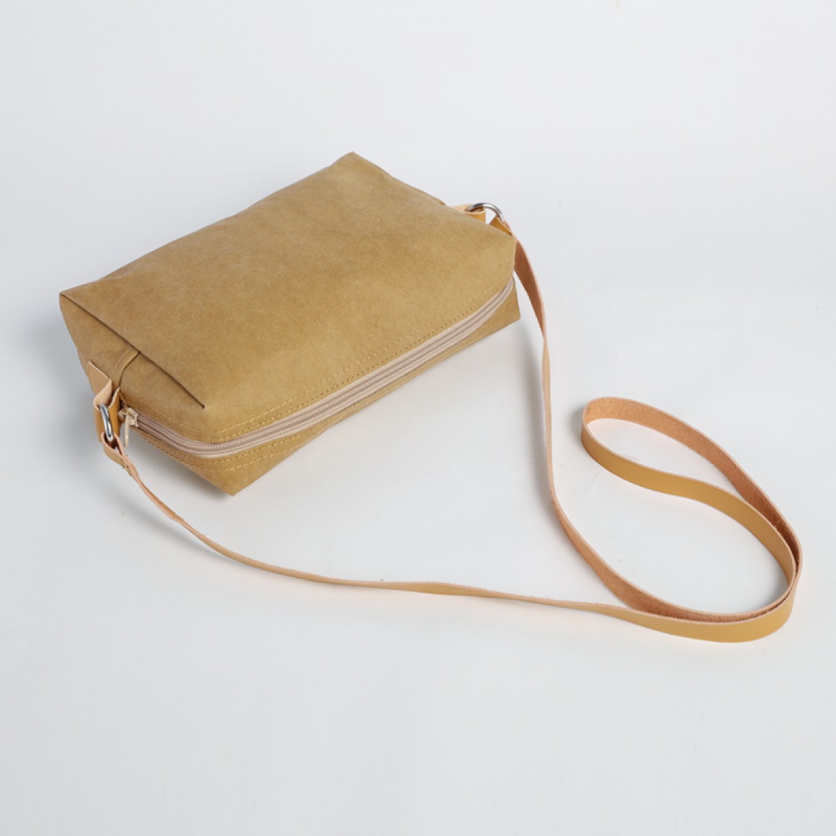 Modna torbica za čez ramo iz trpežnega pralnega kraft papirja in usnjenim trakom in notranjo oblogo iz tkanine.