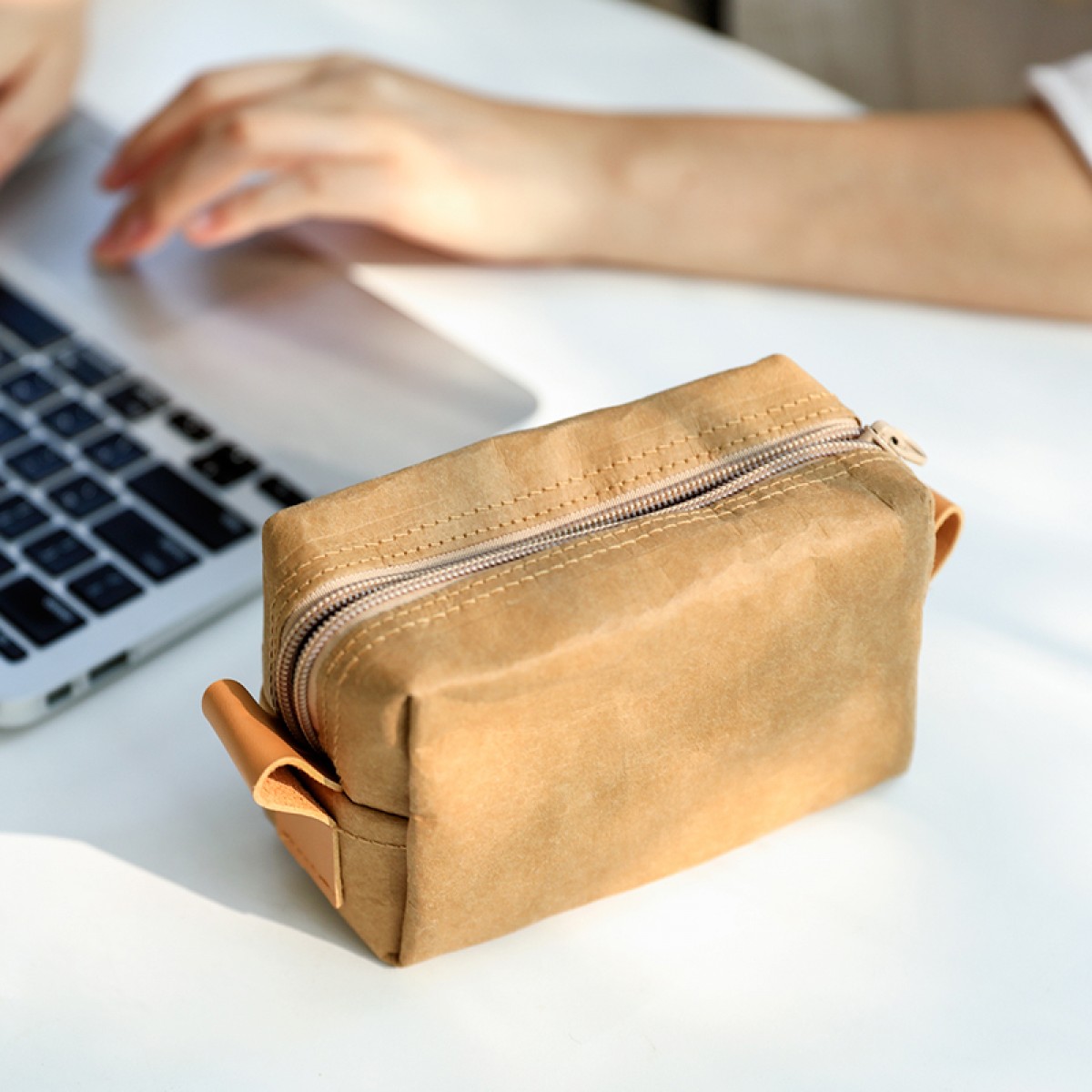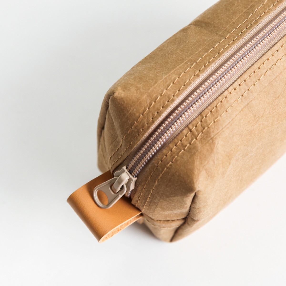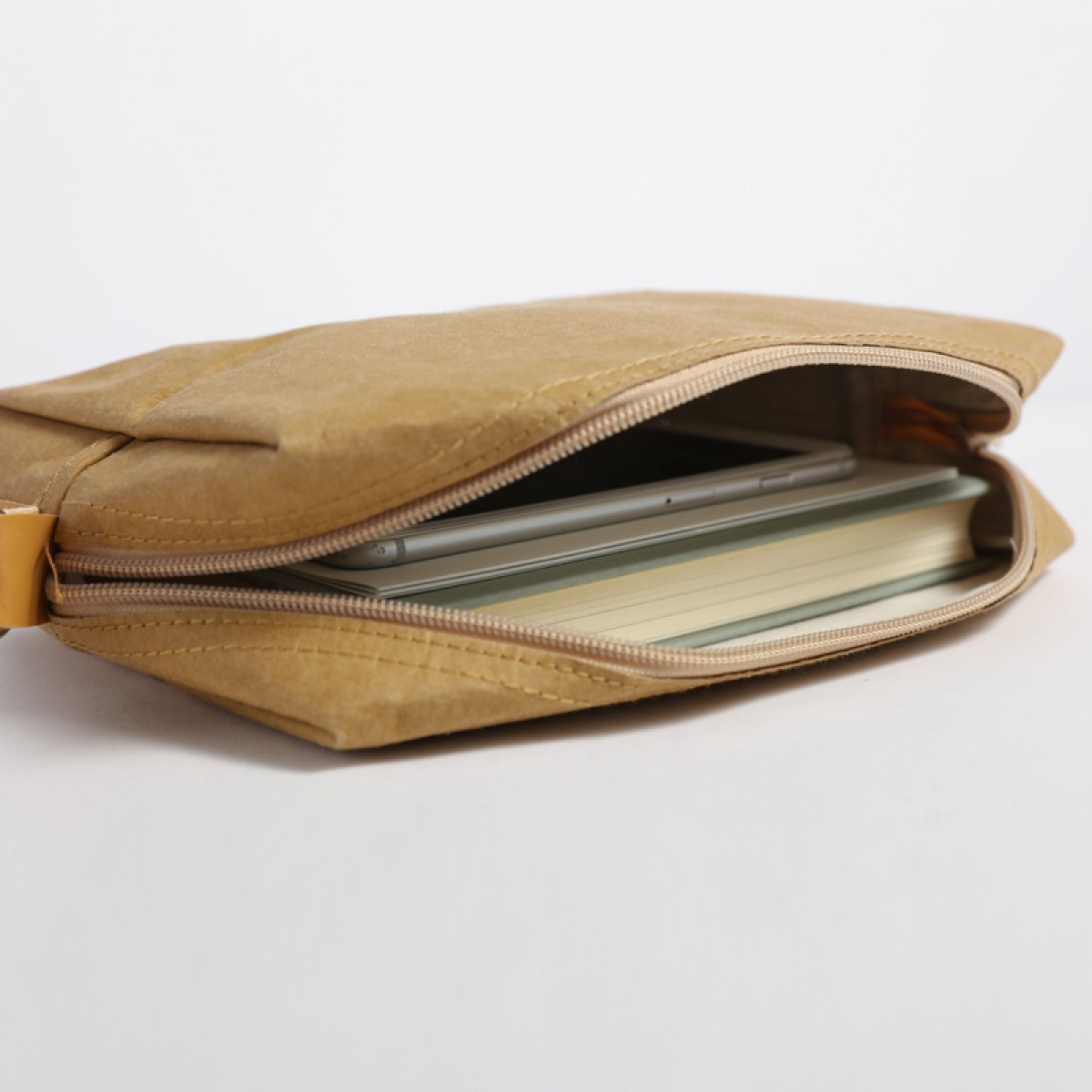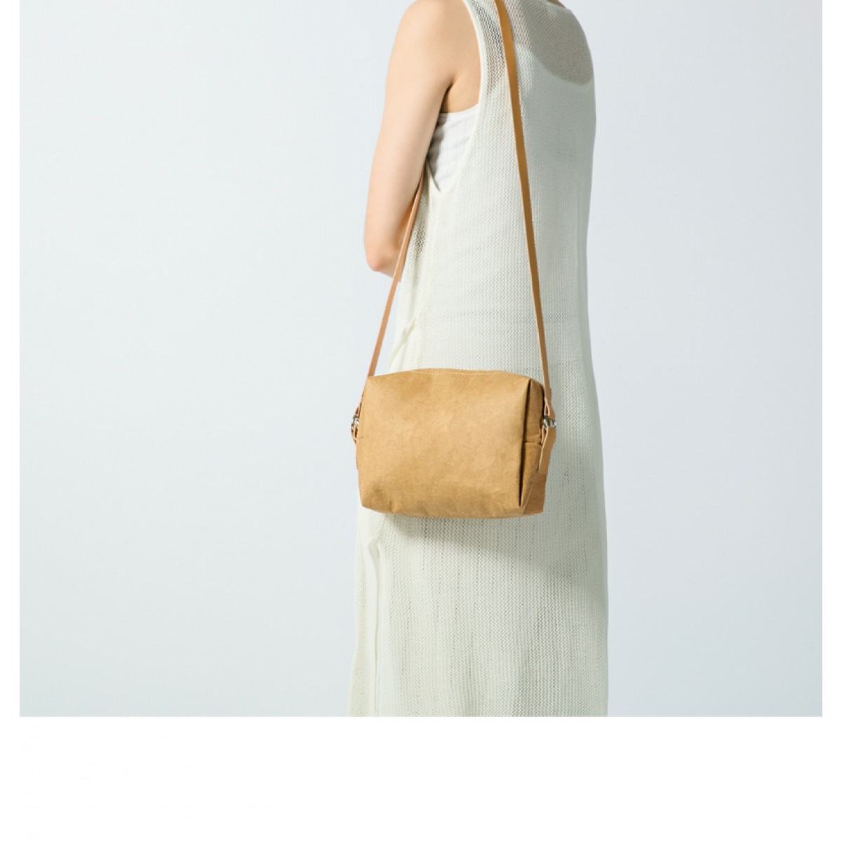 Modna torbica za čez ramo iz trpežnega pralnega kraft papirja in usnjenim trakom in notranjo oblogo iz tkanine.